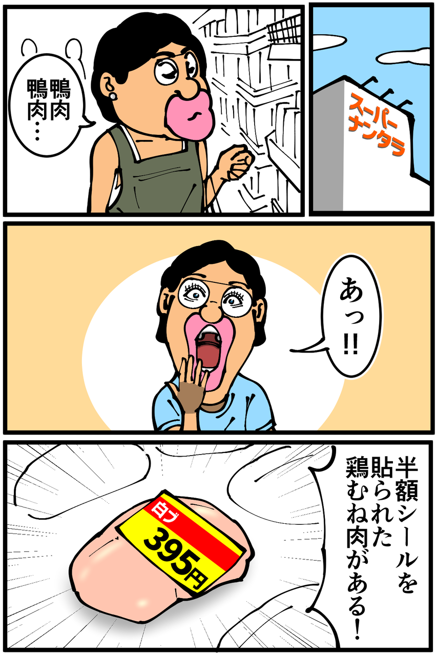 鴨肉探して、安くなった鶏肉買ってまっいっかって、現実の先生ですね。