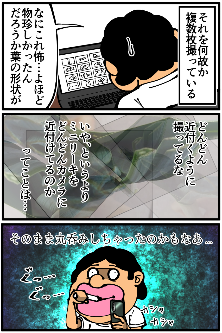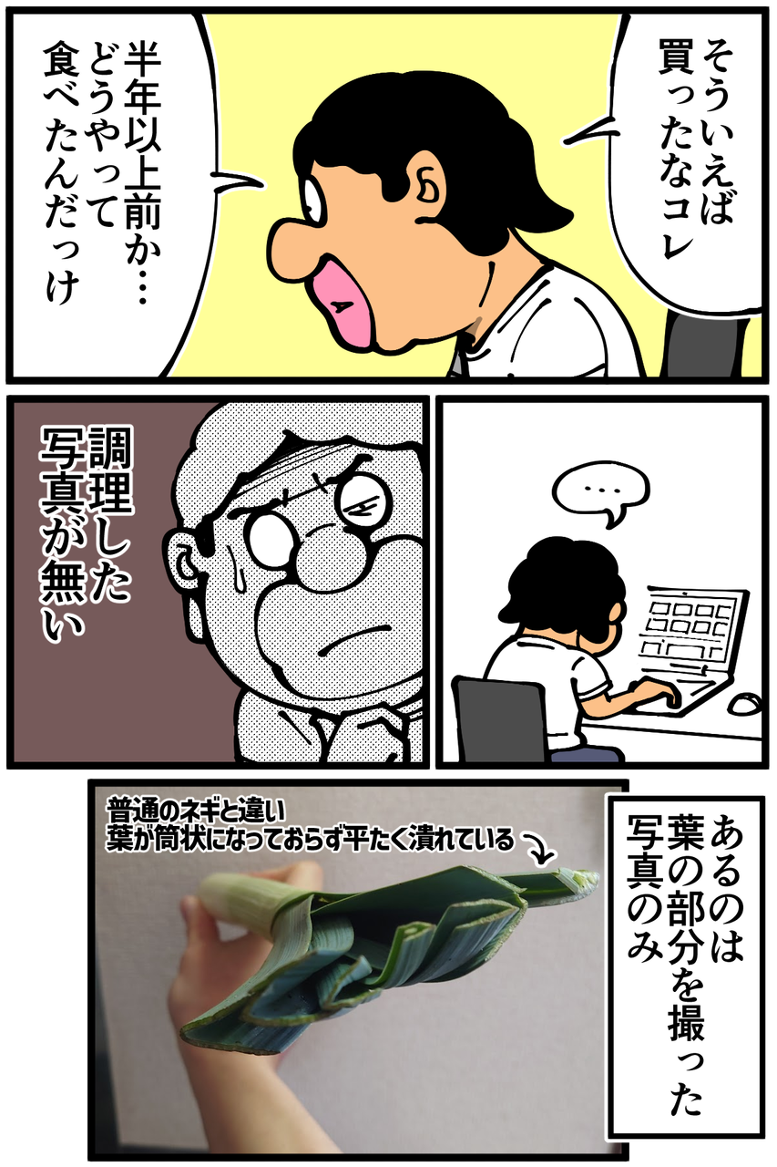 第1437話「アルバムにある『ミニリーキ』の写真の謎」 2023年06月28日 安アパートでカツカツな生活を送る男の漫画ブログです。金が底を尽きてくたばるようなことがなければ毎日更新します。せっかく普段買わないような食材を買ったのに食べた記憶が無くて残念です。というか半年前程度の出来事を綺麗に忘れているという事実が怖い。次の記事↓ 普通のネギはよく買って適当に焼いて食べたりするのでその記憶と混ざっているのかもしれない↓自然食品店とか輸入食品店、見慣れない食品だらけで楽しいのでたまに行きたくなる↓ ●Twitterやってます。●Instagramでブログの過去記事など更新してます↓●登録していただくと更新通知がLINEで届きます↓●こちらのページから過去記事一覧が見られます↓●LINEスタンプ販売中です。 「絵日記」カテゴリの最新記事 < 前の記事次の記事 > コメント コメント一覧 (28) 1. あろまち 2023年06月28日 23:14 ネギ味噌作ったときのネギ…? 0 taikutsu_ken がしました 15. 退屈健 2023年06月30日 14:03 >>1 あっ!と思ったけどネギ味噌のネギは確か普通のネギだったような…!笑 0 taikutsu_ken がしました 2. くらら 2023年06月28日 23:17 まるのみ〜 退屈先生インパクトありすぎです でも生のネギのまるかじりはちょっとおすすめできません せめて焼けばおいしくいただけます 0 taikutsu_ken がしました 16. 退屈健 2023年06月30日 14:03 >>2 生ネギ丸かじりはちょっとワイルドすぎますね!笑 0 taikutsu_ken がしました 3. ごみむしまん 2023年06月28日 23:21 ホラー記事にカテゴリ分けしておきますね 0 taikutsu_ken がしました 17. 退屈健 2023年06月30日 14:04 >>3 カテゴリ的にはそれが正解ですね!笑 0 taikutsu_ken がしました 4. 時間の翼アドバァァァアイス 2023年06月28日 23:50 丸呑み説が有力ですよ先生よく野菜丸呑みしてましたよねw 0 taikutsu_ken がしました 18. 退屈健 2023年06月30日 14:04 >>4 それが有力説ですね!笑 0 taikutsu_ken がしました 5. あるある 2023年06月29日 00:45 冷蔵庫の横とかに落ちてますよ。 カピカピになって・・・ 0 taikutsu_ken がしました 19. 退屈健 2023年06月30日 14:05 >>5 確かにそれはあるある!!でもネギがそうなっていたら虫がたかっていそうで怖い…!笑 0 taikutsu_ken がしました 6. 名無 2023年06月29日 00:56 スカイリムで見るヤツだ 0 taikutsu_ken がしました 20. 退屈健 2023年06月30日 14:06 >>6 こんな要素があるんですか!笑 0 taikutsu_ken がしました 7. ペドロ 2023年06月29日 01:22 丸かじりして終り。 癖になってるから記憶が無いんですよ。 0 taikutsu_ken がしました 21. 退屈健 2023年06月30日 14:07 >>7 もはや無意識下での行動…!笑 0 taikutsu_ken がしました 8. ゆきちお 2023年06月29日 06:15 煮込むとトロトロになって美味しいやつですよね。 丸齧りはありえ…ますかね💦 0 taikutsu_ken がしました 22. 退屈健 2023年06月30日 14:08 >>8 有り得ないと言い切れないのが怖い…!笑 0 taikutsu_ken がしました 9. ユーリ 2023年06月29日 07:37 カメラで撮りながら、だんだん我慢できなくなって食べちゃったんですかね笑 それは、なんかかわいいのかも。小さい子みたいで笑 0 taikutsu_ken がしました 23. 退屈健 2023年06月30日 14:08 >>9 子供がやったら可愛いんですが僕がそれをやったらただの地獄絵図ですね!笑 0 taikutsu_ken がしました 10. てか 2023年06月29日 08:12 丸呑み 笑笑 0 taikutsu_ken がしました 24. 退屈健 2023年06月30日 14:09 >>10 恐ろしいですね!笑 0 taikutsu_ken がしました 11. 2−10(ニート) ※安全なブログです 2023年06月29日 08:45 途中から、「あぁ、丸のみかな〜」なんて考えて納得している私はきっと末期 0 taikutsu_ken がしました 25. 退屈健 2023年06月30日 14:09 >>11 鋭い!!笑 0 taikutsu_ken がしました 12. 金欠マン 2023年06月29日 15:42 丸のみもう人間じゃねぇ👽 0 taikutsu_ken がしました 26. 退屈健 2023年06月30日 14:09 >>12 もはや人間じゃないですね!笑 0 taikutsu_ken がしました 13. しゅうじょう 2023年06月29日 16:07 ミニリーキの『ミニ』って、サイズとかなのでしょうか🤔 0 taikutsu_ken がしました 27. 退屈健 2023年06月30日 14:10 >>13 早採りしたリーキなのでそう呼ぶそうです!🌱 0 taikutsu_ken がしました 14. けたこ 2023年06月29日 22:16 先生、思い出して! そのリーキはバターでソテーして前日から仕込んだフォンと手作りのブーケガルニでスープに仕上げたはず カツカツ生活とかけ離れたから証拠の画像と記憶を消したに違いないですよ 0 taikutsu_ken がしました 28. 退屈健 2023年06月30日 14:11 >>14 あっ、そうでした!!それを作ったんでしたね~!フォンと手作りのブルゲルガニのガノンドロフアントニオホドリゴノゲイラに!(錯乱) 0 taikutsu_ken がしました コメントフォーム 名前 コメント 記事の評価 リセット リセット 顔 星 情報を記憶 コメントを投稿する