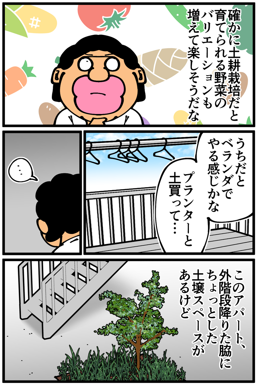 第1438話「土耕栽培にチャレンジしたい」 2023年06月29日 安アパートでカツカツな生活を送る男の漫画ブログです。金が底を尽きてくたばるようなことがなければ毎日更新します。変なことを考えた数日後に黒いビニールシートでしっかり覆われてました。ごめんなさい。というか覆われていなくても勝手に使おうとするのはヤバすぎるので素直にプランター買ってベランダでチャレンジしてみたいと思います。でもその前に水耕栽培できる野菜を色々試してみたい。次の記事↓ かいわれ大根の栽培で起きた悲しい事件↓ 畑荒らし顔↓ ●Twitterやってます。●Instagramでブログの過去記事など更新してます↓●登録していただくと更新通知がLINEで届きます↓●こちらのページから過去記事一覧が見られます↓●LINEスタンプ販売中です。 「絵日記」カテゴリの最新記事 < 前の記事次の記事 > コメント コメント一覧 (42) 1. くらら 2023年06月29日 23:01 ベランダ栽培いいですね しそやトマトなんて簡単ですよ 食費の節約にもなりますからね 0 taikutsu_ken がしました 19. 退屈健 2023年06月30日 14:49 >>1 いいですね~!簡単にできるんですね! どっちも大好きなのでいつか挑戦してみます!! 0 taikutsu_ken がしました 2. 鶏もも肉 2023年06月29日 23:04 何も起きてない日をこんなにおもしろく描けるのがすごい 0 taikutsu_ken がしました 20. 退屈健 2023年06月30日 14:49 >>2 とんでもないです、そう言っていただきありがとうございます!笑 0 taikutsu_ken がしました 3. ぽちた 2023年06月29日 23:04 普通に雑草が伸びすぎたので土を消毒してるんでしょう 何日かしたらきれいなお花がうわってるんじゃないでしょうか まあ他人の土地ですから勝手に植えるのはダメですよね 0 taikutsu_ken がしました 21. 退屈健 2023年06月30日 14:53 >>3 なるほど、消毒でしたか! 危うく犯罪行為に手を染めるところでした…!笑 0 taikutsu_ken がしました 4. えむけい 2023年06月29日 23:06 大家さんに相談してみたら意外と使わせてくれるかもしれませんよ 0 taikutsu_ken がしました 22. 退屈健 2023年06月30日 14:54 >>4 栽培の相談、意外といけますかね!笑 0 taikutsu_ken がしました 5. 除湿機年中稼働者 2023年06月29日 23:10 世の大家さんは園芸好きな人が多いのかもしれません 一階の角部屋なのですが部屋のすぐ外側が植え込みな上に大家さんが園芸好きで雨が降らないときはご丁寧に水撒きをしているので湿度の高さが加速されている気がします 0 taikutsu_ken がしました 23. 退屈健 2023年06月30日 15:19 >>5 おお、それはかなりの加湿効果がありそうですね!笑 でもすぐ部屋の近くに植え込みがあるのは見ていて楽しそうで羨ましい! 0 taikutsu_ken がしました 6. ぬみこ 2023年06月29日 23:16 あたしンちでお母さんがベランダで野菜栽培しているお話があったような?? 0 taikutsu_ken がしました 24. 退屈健 2023年06月30日 15:20 >>6 ありましたね!ほおずきの話でしょうか!笑 0 taikutsu_ken がしました 7. けたこ 2023年06月29日 23:18 いやいや、案外もて余して雑草生えないようにするだけで精一杯なのかも お世話してくれる人がいたら喜ばれるかもしれませんよ ……と思ったけど先生は綺麗なお花やグランドカバー植物じゃなくて 豆苗とか葱とかカイワレとか育てる気でしたね やっぱりベランダ使いましょ ミニトマト、おすすめですよ 時期ちょっと外すと苗も安いし 0 taikutsu_ken がしました 25. 退屈健 2023年06月30日 15:20 >>7 そうなんです、豆苗とか育てたくて!笑 ミニトマトいいですね~!今度ベランダで挑戦してみます! 0 taikutsu_ken がしました 41. 小手毬 2023年07月04日 12:09 >>25 ミニトマト、意外とムズいです 家で沢山実ったら安上がり!とか思ってたけど、元の苗の値段に、肥料や育ちやすい土、毎日の水揚げや、虫に食われない様に気をつけたり… その割にたいして実らなくて… 買った方が安い!!!! …てなりました💦 0 taikutsu_ken がしました 8. 栽培長 2023年06月29日 23:38 ベランダでのプランターも物件によっては許可されてない場合があるので契約内容読み返してくださいね! 0 taikutsu_ken がしました 26. 退屈健 2023年06月30日 15:21 >>8 おお、それは危ない!!ありがとうございます確認してみます! 0 taikutsu_ken がしました 9. じる 2023年06月30日 00:53 小学生の頃、実験で使ったインゲン豆をプランターに植えたら ゴリゴリのインゲン豆が収穫できたのを思い出しました。 0 taikutsu_ken がしました 27. 退屈健 2023年06月30日 15:21 >>9 マジですか!羨ましい!!笑 0 taikutsu_ken がしました 10. うちだ 2023年06月30日 00:58 先生のおウチにベランダがあるのにびっくりしましたwww 種からだと失敗しがちなので、割高でも苗を買ったほうがいいです 青じそ、バジル、唐辛子、ゴーヤなんかは育てやすいかなと 自給自足編、楽しみにしております 0 taikutsu_ken がしました 28. 退屈健 2023年06月30日 15:22 >>10 そうなんです、今のアパートには実はあります!笑 おおー!それらの野菜どれも大好きなので苗買って挑戦してみます!! 0 taikutsu_ken がしました 11. 2−10(ニート) ※安全なブログです 2023年06月30日 02:17 アブナカッタ
