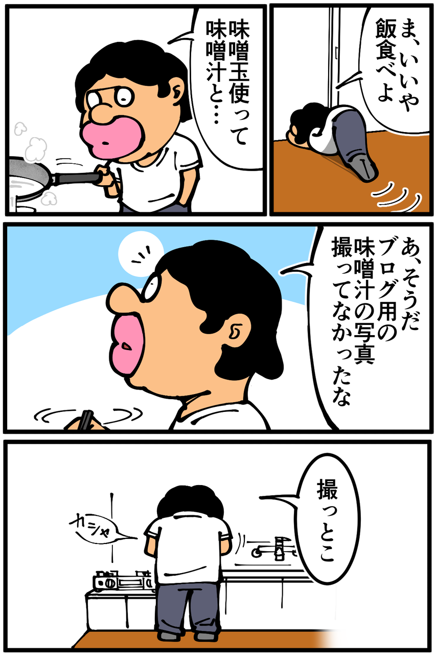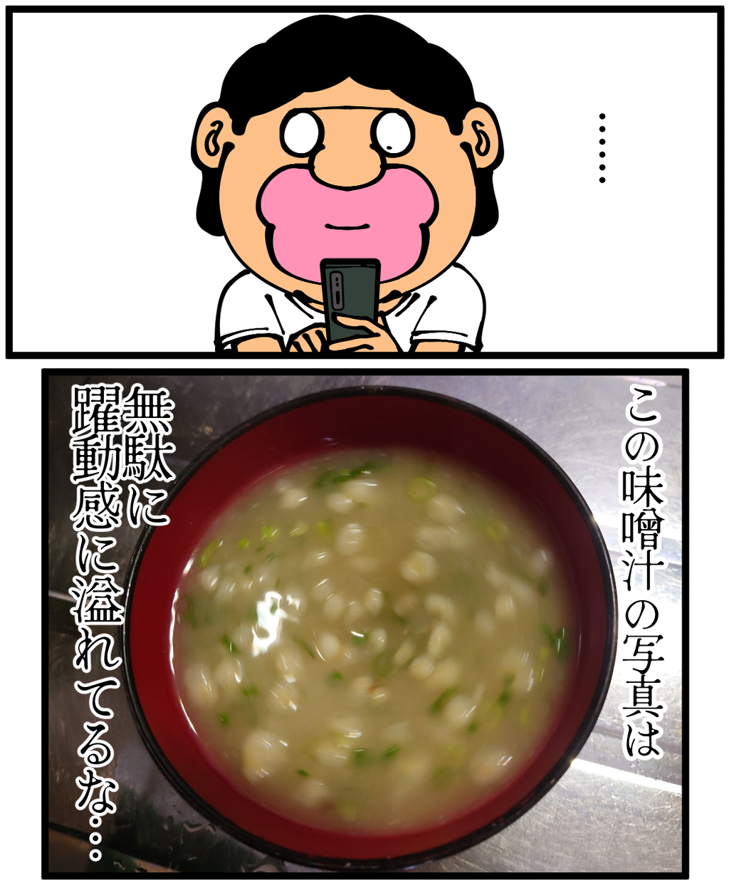 気付いて撮り直したので事なきを得たんですがもし気付かなかったら前回の記事の最後にこの謎の高速回転味噌汁写真を載せることになってました。