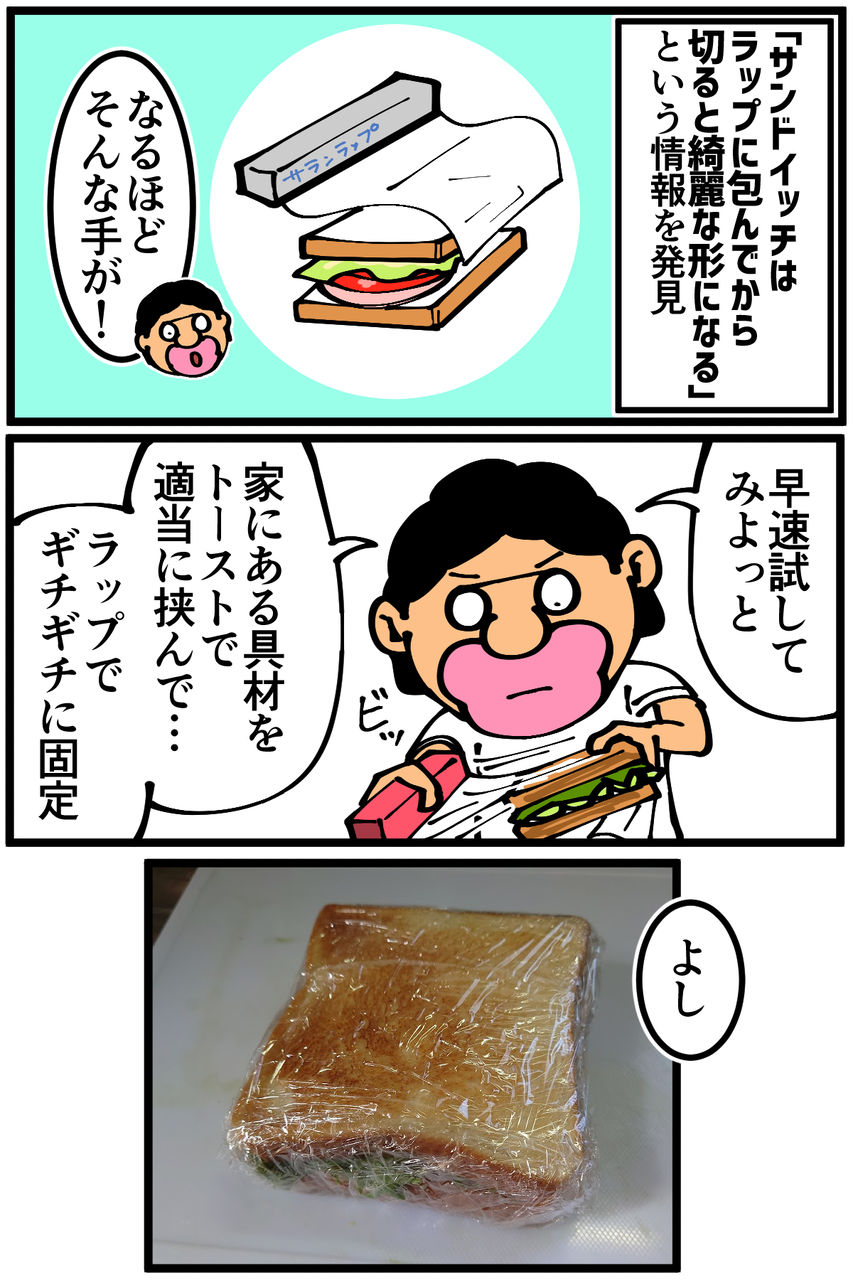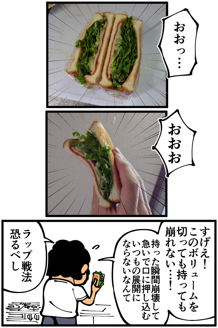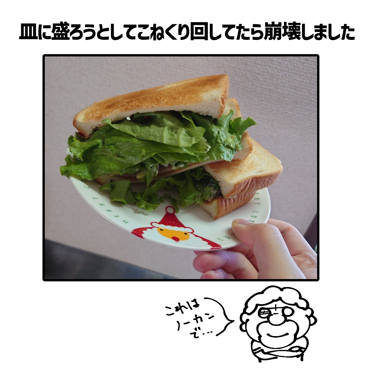 厚切り食パンをトースとして、レタスをたっぷり、ハムとチーズ&マヨネーズをはさみ、カラシとコショウで味付して…