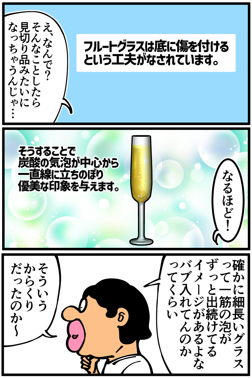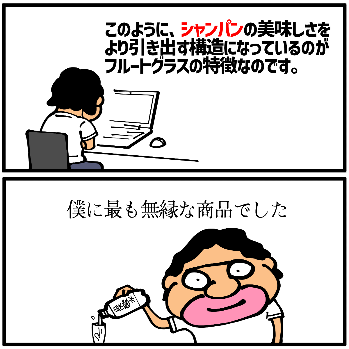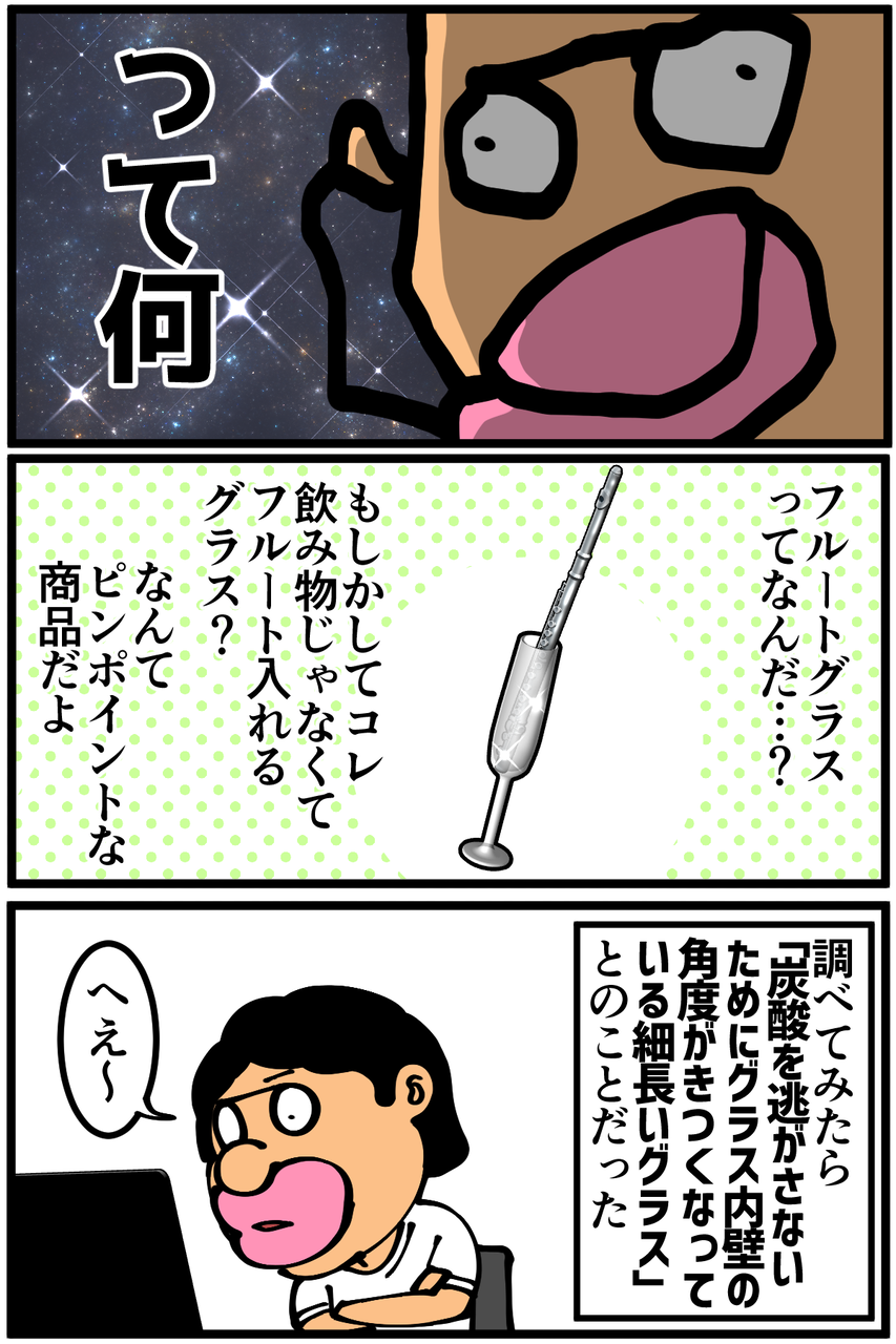 シャンパンの美味しさを存分に味わうためのグラスだったようです。金欠を極めた私の中ではシャンパンはもはや空想上の飲み物と化していたんですが実在してるんですね。