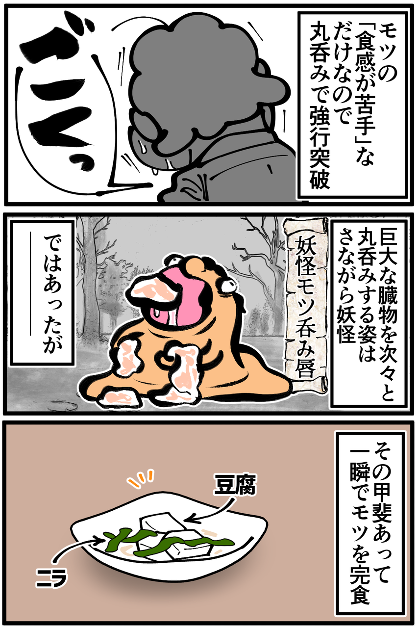 私はいつも、もつは「くっちょんくちょんしてるなあ。」と思って噛んでます。飲み込むタイミングがわからない。