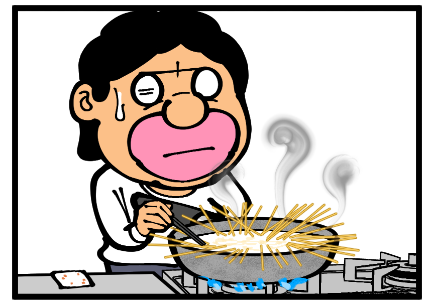 急いで無理やり押し込んでも間に合わずに焦げるんですがこれってどうしたらよいのでしょうか。もっと大きいフライパンか深めの鍋買えよって話だけど。