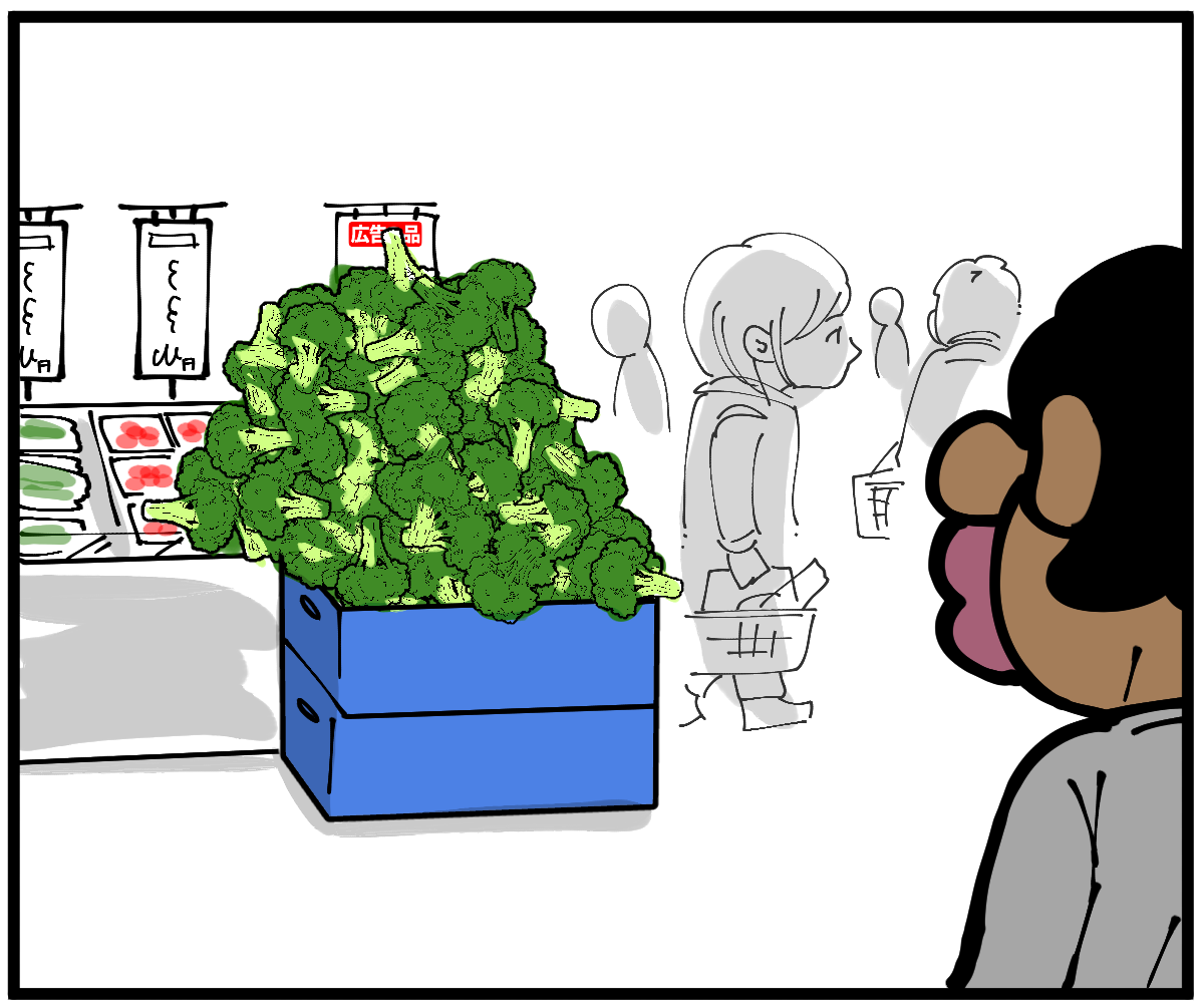 最寄りのスーパーでは時折ブロッコリーが売り場に大量に積まれていることがあり、場合によっては商品POPが覆われて値段の確認ができないような状態になっていたりすることもあるんですが、