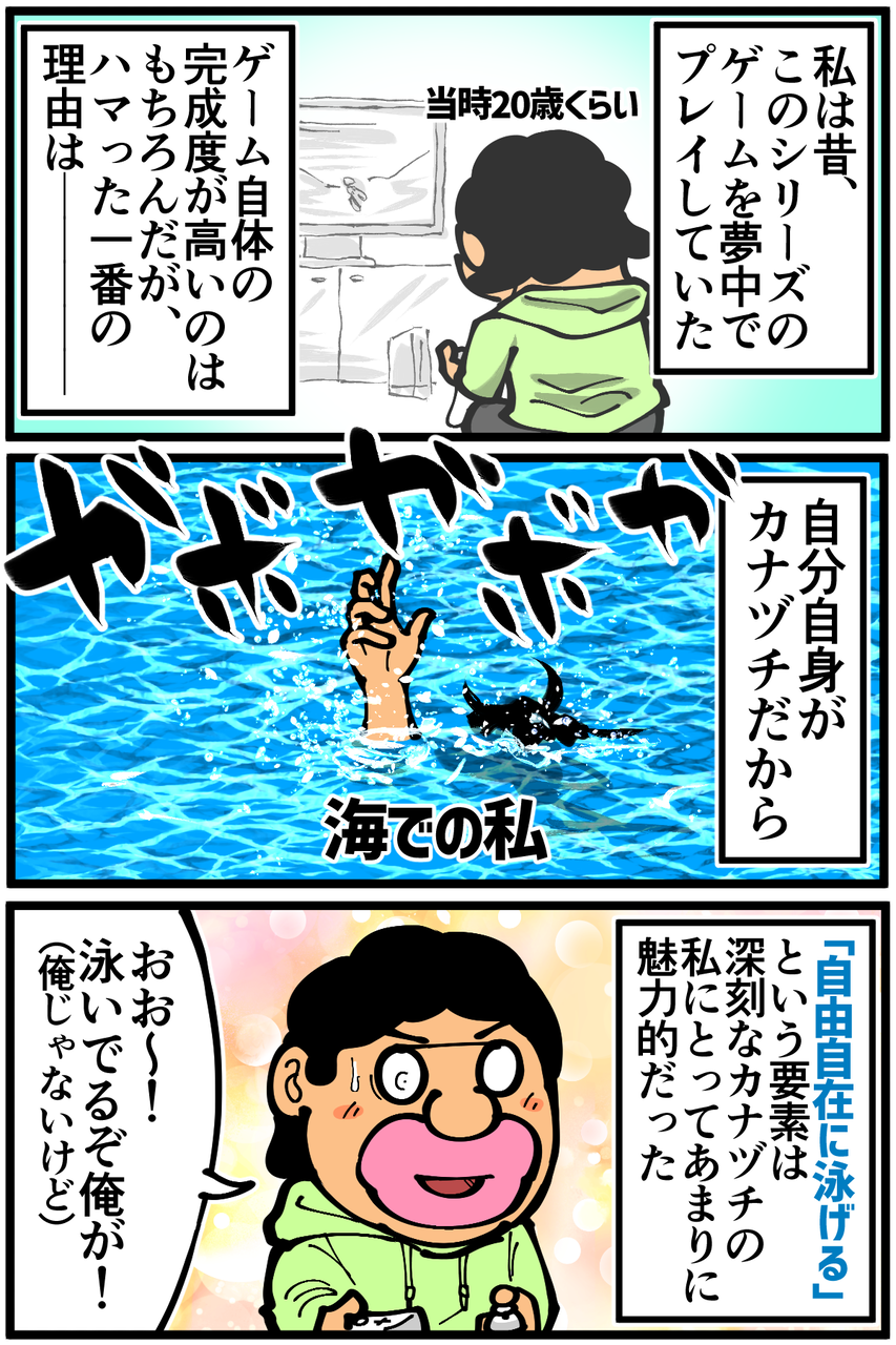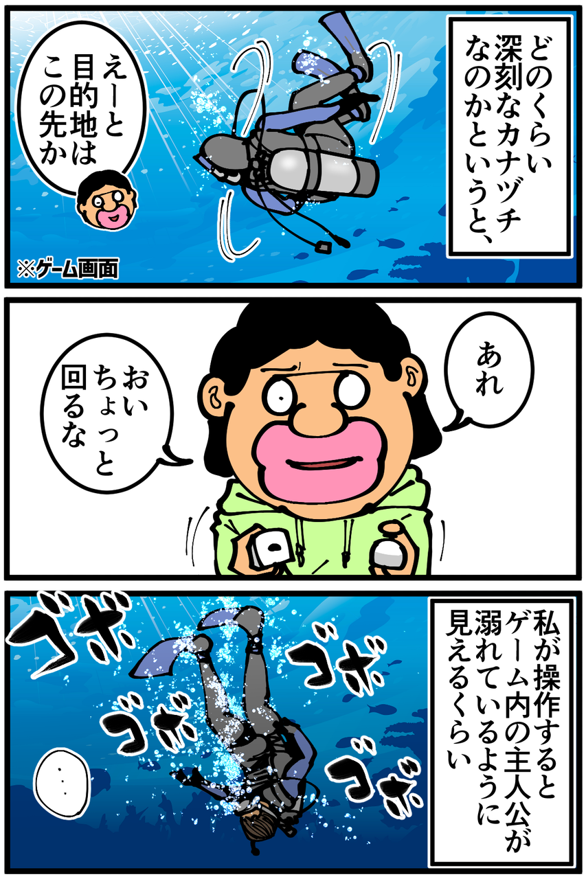 念のため補足しておくと海中を自在に泳ぎ回れるゲームなので本来溺れることはできないんですが私のカナヅチ具合が主人公に伝染しているのかゲームが下手過ぎるのか、パニック状態の素人みたいな挙動になることがよくありました。なんか一人でひっくり返ってジタバタしてるところを仲間ダイバーに心配そうに見られていたのを思い出します。