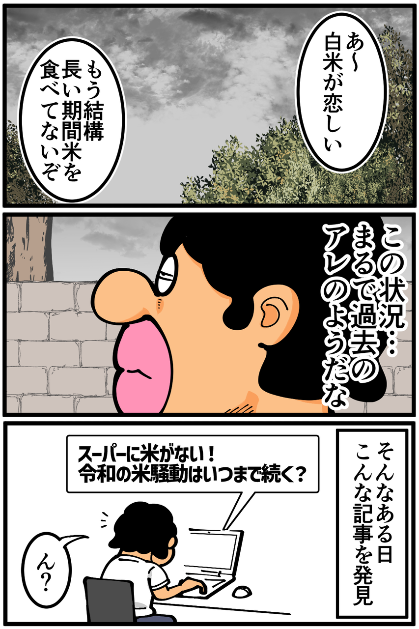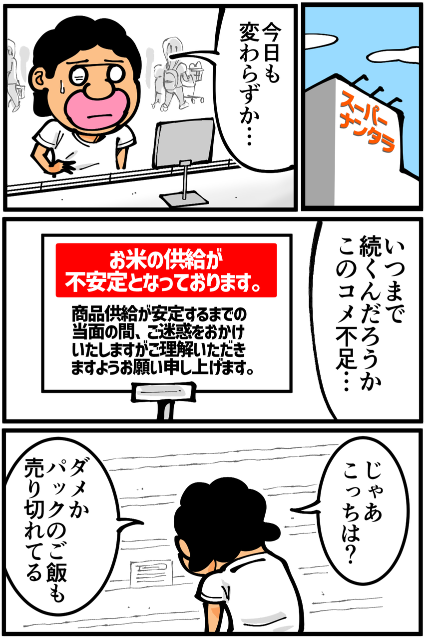 第1757話「お米が食べられない日々」 2024年08月29日 当時は炊飯器が無かった上にコスパの関係でパックご飯より麺類を優先して食べていたので、数ヶ月にわたって白米を食べていないようなことが結構あった気がします。今はもうたった数日でも耐えられない。お米食べたい。次の記事↓ 炊飯器を買った当時の悩み↓Kindleインディーズ無料マンガを出版しました↓●登録していただくとライブドアアプリから更新通知が届きます↓(ライブドアアプリについて)●X(旧Twitter)やってます↓●Instagramでブログの過去記事など更新してます↓ 「絵日記」カテゴリの最新記事 < 前の記事次の記事 > コメント コメント一覧 (18) 1. ぽちた 2024年08月29日 22:15 自分は関西ですがこちらもどこのスーパーに行ってもお米がありません💦 パックご飯ですら売ってなくて元お米売り場にはレトルトお粥と正月でもないのにお餅だけが置いてありました🥹 はやく新米が出回るといいですね 0 taikutsu_ken がしました 2. 筆きなこ 2024年08月29日 22:36 窓から見える田んぼの稲が台風で横倒し 今年の新米も気がかり 0 taikutsu_ken がしました 3. あの 2024年08月29日 22:42 どうしても米が食べたいならスーパーやコンビニのおにぎりや炊き込みご飯はどうでしょう 0 taikutsu_ken がしました 4. れん 2024年08月29日 22:50 こっちは最終手段・お米屋さんで注文した でも高い…だから、先生はお米がまとまった欲しかったらさらに働け〜働くのだ〜← まあそれは半分は冗談として、台風過ぎたら夜のスーパーにGOだ。安くなってるのがあるはず 0 taikutsu_ken がしました 5. 通りすがり 2024年08月29日 23:04 お米が無いなら、パスタを食べればいいじゃない 0 taikutsu_ken がしました 6. かな 2024年08月30日 03:21 都会だけなのかなぁ 私の地域では普通に手に入るしどこのお店でも品薄にはなってなくて。気になって、お店に行くたびにみてるんですが😅 0 taikutsu_ken がしました 7. ゆずきち 2024年08月30日 04:45 色んなところでこの話題を目にしますが私の地域普通に米売ってる(一家族おひとつまでとかの制限はありますが)からあんまり実感ないんですよね。地域によるのかな??? 0 taikutsu_ken がしました 17. 2024年09月11日 20:37 >>7 田舎はあるって風の噂で聞きました 23区は2ヶ月位見てません 0 taikutsu_ken がしました 8. ゆきちお 2024年08月30日 04:48 ウチの近所のスーパーの米コーナー、モチと鯖缶が並んでて笑いました😭 入荷は少しずつしてるようですが、タイミング悪いと買えないですよね。 0 taikutsu_ken がしました 9. お米たべたいねぇ 2024年08月30日 05:14 田舎暮らしですけど米農家から年間契約で買ってます。そこでも「品薄?」と首かしげてたのになぁ。スーパーは棚がガラガラです。 観光客が買ってるのかなぁと思ってます。 0 taikutsu_ken がしました 10. ダークマターたかっぴ 2024年08月30日 07:10 そもそもテレビ等のメディアが台風の影響で「米不足」と勝手に煽ったり、そういうのを見た転売ヤーが米を買い占めてメルカリ等で売ったりと迷惑極まりないことばかりしてるんですよ…… 0 taikutsu_ken がしました 11. ほんとそれ 2024年08月30日 09:35 >>10 うちの地域も2週間前は普通に米売ってたのに今はすっからかん! 1回炊く分しかなかったから、たまたま売ってた鹿児島産の無洗米コシヒカリ買ったらめっちゃ旨くてラッキー(笑) 0 taikutsu_ken がしました 12. 初投稿です 2024年08月30日 09:46 買い占めと転売ヤーの愚行だと思います。 不安を煽る報道が多いのも要因ですね...。 ワタシ新潟県民で半分農家なんですけど、早生品種はもう出荷されたのでじきに流通すると思います! 0 taikutsu_ken がしました 13. ぴぷ 2024年08月30日 12:24 大阪の田舎の方ですけどほちぼち供給が追いついてきたのかちらほら見かけるようになってきました。 マスコミが煽るせいで買い占めたり転売したりする人がいますけど、今回の騒動は一時的なものです。 今のうちは節約も兼ねて素パスタで乗り切って、米が普通に買えた頃に焼肉でも食べましょう。 0 taikutsu_ken がしました 14. 紅茶スキー 2024年08月30日 21:37 正直、この記事読むまで、先生には関係ない話だなと思ってました 0 taikutsu_ken がしました 15. 朝イチ 2024年09月01日 02:17 開店してすぐなら売ってるスーパー多いですね 昼過ぎに無くなるのは老人が買い占めてるからだそうで… 激安なやつはないですが💦 0 taikutsu_ken がしました 16. ぽんぽ 2024年09月11日 05:17 うちは米農家だけど日本では米が売れないから海外に販売してる。米がない時だけ米農家に米を売れという日本人大嫌い!普段から買えよ!って思う 無駄になった米の処分とかなんも考えてない日本人! 0 taikutsu_ken がしました 18. 確かに… 2024年09月13日 09:53 >>16 (´;ω;`)ウッ…なんか、すみません。 日本米大好きです… 0 taikutsu_ken がしました コメントフォーム 名前 コメント 記事の評価 リセット リセット 顔 星 情報を記憶 コメントを投稿する