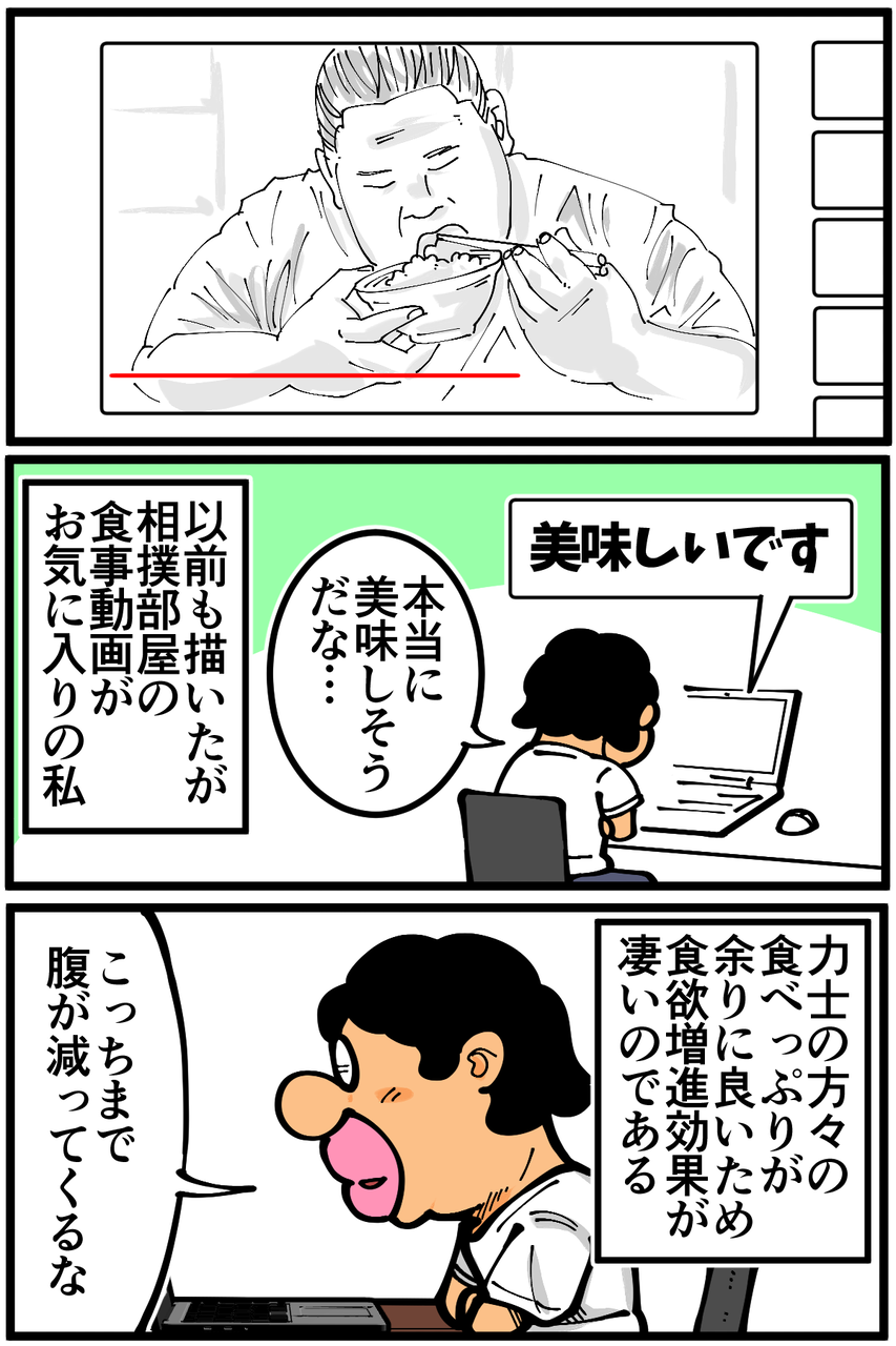 矛盾するようですが力士の方々は美味しそうに食べまくるのでめちゃくちゃ飯テロ効果がある反面、身体作りのために物凄い量を食べられるので最後まで観続けることで満腹感も得られる。