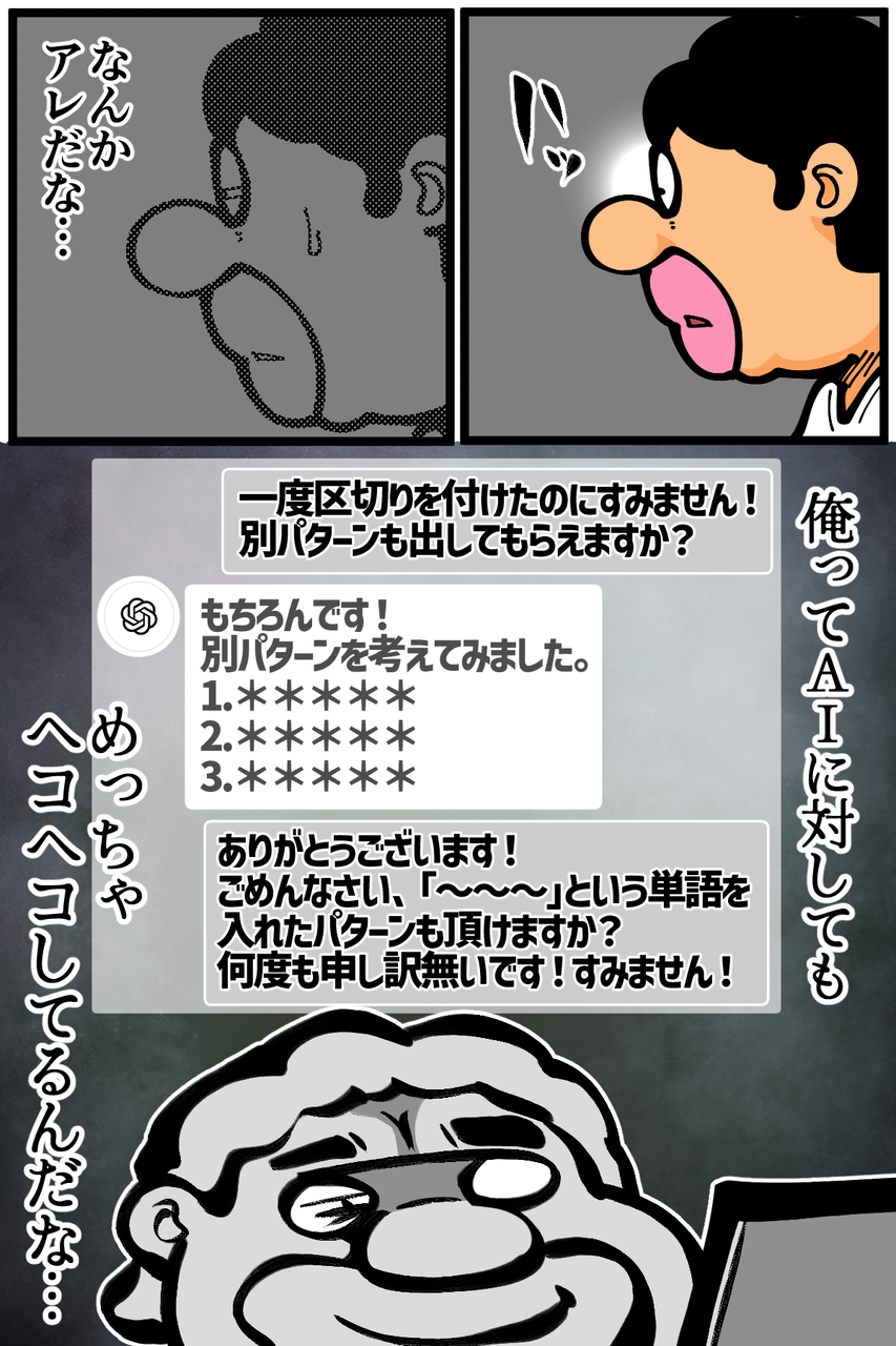 そういった必要がないはずなのに、AIが出してくれたアイデアに対して「おおおお!!!素晴らしいアイデアです流石ですね!!!!」とついついヨイショしちゃうのも直らない…!
