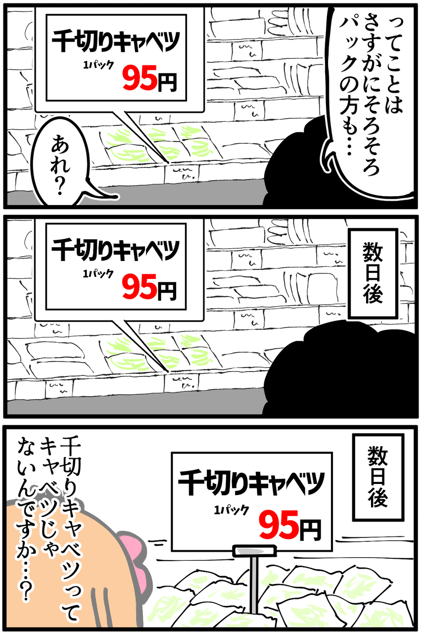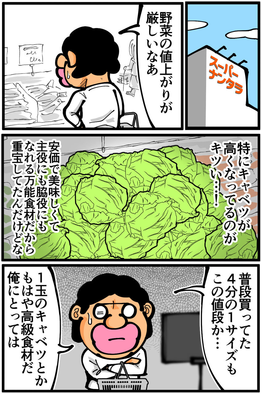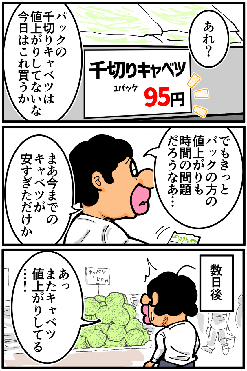 第1796話「キャベツの値上がり」 2025年02月03日 永遠に変わらない。この空間だけ別の世界線にいるかのようです。めちゃくちゃありがたいんですが何故なのか不思議…!なんでもキャベツでカサ増ししたい↓ Kindleインディーズ無料マンガを出版しました↓ ●登録していただくとライブドアアプリから更新通知が届きます↓(ライブドアアプリについて)●X(旧Twitter)やってます↓●Instagramでブログの過去記事など更新してます↓ 「絵日記」カテゴリの最新記事 < 前の記事次の記事 > コメント コメント一覧 (10) 1. ぽちた 2025年02月03日 22:31 キャベツ高いですよね うちの近所のスーパーではひとたま698えんです 中国産の安いキャベツがはいってくるそうなんですがもしかしたら安い千切りキャベツはすでに中国からきてるんじゃないんですか 0 taikutsu_ken がしました 2. み 2025年02月03日 22:33 キャベツの値上がり本当びっくりですよね。1ヶ月くらい前ですが1個650円の店があって目を疑いました。もやしと豆苗、きのこ類の安さに助けられています。 0 taikutsu_ken がしました 3. りん 2025年02月03日 22:44 テレビで見ましたが、カット野菜は契約農家から買い取って作っているため値段が一定だそうです。 しかし、カット野菜が売れ過ぎて野菜が足りなくなる→契約農家以外から買い取る→カットしてない野菜が足りなくて高くなる …って感じらしいですよ。 0 taikutsu_ken がしました 4. ぺこ太郎 2025年02月03日 22:48 豊作過ぎてトラクターで踏み潰して廃棄してしまう年もあれば、今年みたいな事もあるし、自然次第の々のご苦労は計り知れないですよね。 カメムシのせいで今年はみかんも高すぎて買えやしない。 0 taikutsu_ken がしました 5. ぽにょ 2025年02月04日 02:06 一時的に量を減らすってニュースで見ましたね うちの近くのスーパーは一玉298円になりました! 0 taikutsu_ken がしました 6. ゆきちお 2025年02月04日 03:40 安定のカット野菜‼️ ありがたや😭 0 taikutsu_ken がしました 7. 紅茶スキー 2025年02月04日 07:45 刻みネギなんかは値段固定なんでそれと同じではないでしょうか。 付き合いで仕方なく売っているけど、売れば売るほど赤字になる魔の商品らしいですよ 0 taikutsu_ken がしました 8. ねこたつ 2025年02月04日 10:55 カットキャベツは安いんですね。近所のスーパーでは1玉350円になったのでカット済みの方を買ってみようかなぁ。まな板も汚れないし便利そうです。 0 taikutsu_ken がしました 9. 忍犬 2025年02月05日 20:21 私もカット野菜が安いのでよく購入するのですが、先日ニュースで 工場の方が出演されていて、契約農家から仕入れる値段も市場と同じで 高騰しているけど、カット野菜は100円を超えると買ってもらえなくなるので 辛いけど値上げができないとおっしゃっていました。 これからは感謝して買わないとな…と思いました。 0 taikutsu_ken がしました 10. ぬのハンカチ 2025年02月06日 11:58 毎日更新やめると言ってから、ものすごい更新頻度落ちましたね 0 taikutsu_ken がしました コメントフォーム 名前 コメント 記事の評価 リセット リセット 顔 星 情報を記憶 コメントを投稿する