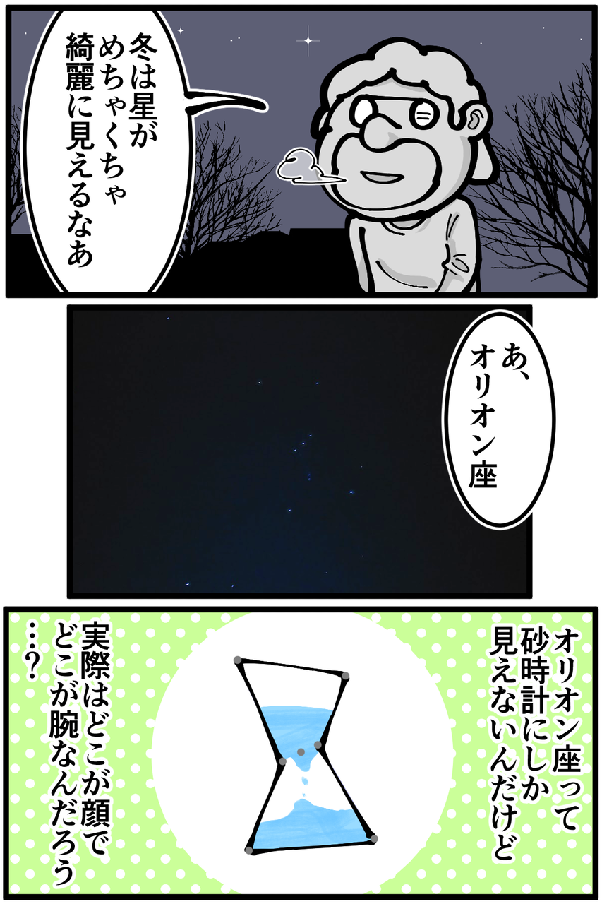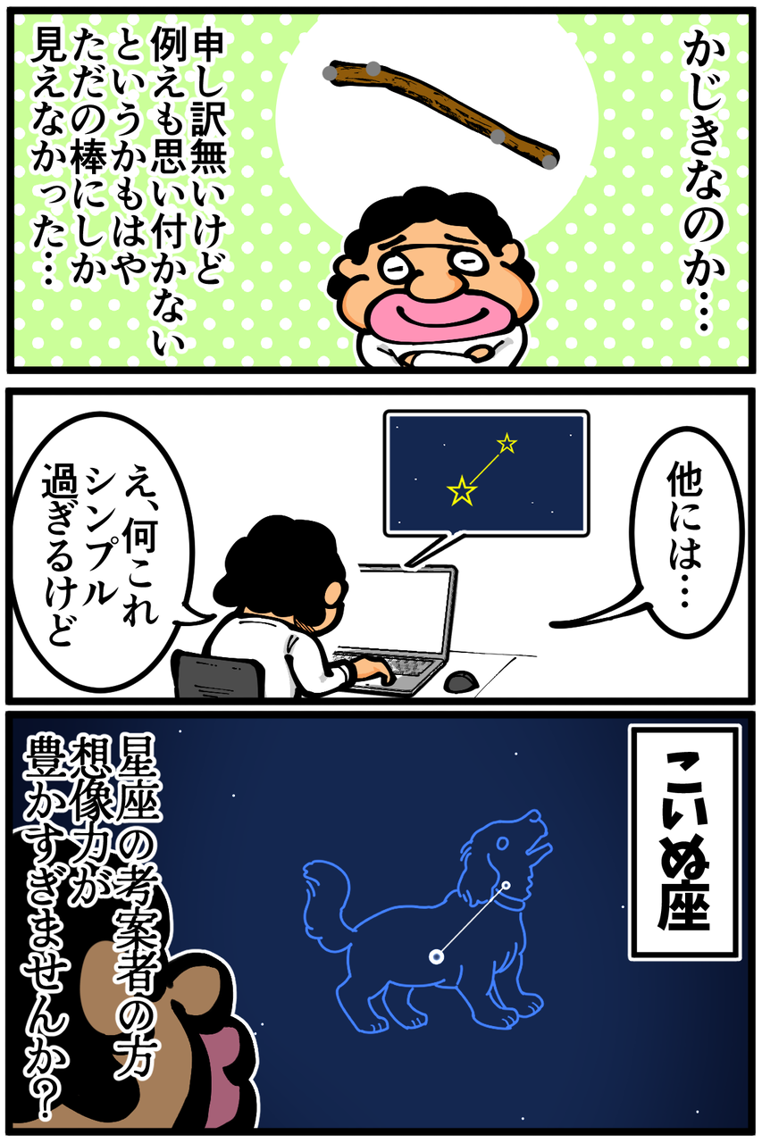 第1799話「オリオン座を見て思ったこと」 2025年02月14日 無から子犬が出てきた!!でもこのくらい想像力が豊かな方がいいですね。私が古代に生きる星座考案者の立場の人間だったら「箱座」とか「ただの棒座」みたいな名称になってしまうところだった。次の記事↓ メカジキ大好き↓ Kindleインディーズ無料マンガを出版しました↓●登録していただくとライブドアアプリから更新通知が届きます↓(ライブドアアプリについて)●X(旧Twitter)やってます↓●Instagramでブログの過去記事など更新してます↓ 「絵日記」カテゴリの最新記事 < 前の記事次の記事 > コメント コメント一覧 (9) 1. ねこたつ 2025年02月14日 22:10 こいぬの適当さが凄い(笑) 0 taikutsu_ken がしました 2. あ 2025年02月14日 22:11 あーなーたーとあなたとあなたとあなたとあなたでオリオーン座みたいなギャグが有ったけど久しく見てない気がするオリオン座 空を見る機会が減ったのか空気が腐ったのか 0 taikutsu_ken がしました 3. ぽちた 2025年02月14日 22:51 大昔の人はTVとかもなくて想像力が半端なかったんですよ どうしたらそう見えるの?という星座ばかりで そこが面白いっちゃ面白いんですけどね 0 taikutsu_ken がしました 4. ペコ太郎 2025年02月14日 22:57 こいぬ座を命名した人に「いやー、これは小猿では?」「小枝座が良いです!」とか反論する人いなかったのかな?夜のゴミ出しの時にいつも夜空を見あげながら帰ってます。オリオン座しか見つけられないけども。 ほんと冬の星座はくっきりキレイに見えますよね! 0 taikutsu_ken がしました 5. むじな 2025年02月14日 23:37 そもそも今と昔とでは肉眼で見える星の数がまるで違うんでしょうね〜 電気やらなんやらで 昔々あるところにいた人々が、特に強い光の星々を結んで星座を想像したと思うとなんか時間の使い方が素敵だなと思います 0 taikutsu_ken がしました 6. ゆきちお 2025年02月15日 03:37 星座って不思議ですね🌌 棒?の周りには今の私達に見えてない細かい星があるのかも‼️ 0 taikutsu_ken がしました 7. モエギ 2025年02月17日 00:13 神話有りきで星座がある感じですから。 そう見えたというより、当てはめられそうな所に当てはめた、のではないでしょうか。 当てはめた人も、「無理あるけど〜」「んーギリギリ行けるか〜」みたいには思ってたかと(笑) 0 taikutsu_ken がしました 8. 名無し 2025年02月24日 01:42 みなさん、さすがですねー。勉強になります。 私は、同感です、というコメントしか思い浮かびませんでした。 0 taikutsu_ken がしました 9. ゆずきち 2025年03月12日 23:02 オリオン座はだいぶ形がわかりやすい方ですよね(笑) 個人的に意味わからん星座殿堂入りはかみのけ座。 0 taikutsu_ken がしました コメントフォーム 名前 コメント 記事の評価 リセット リセット 顔 星 情報を記憶 コメントを投稿する
