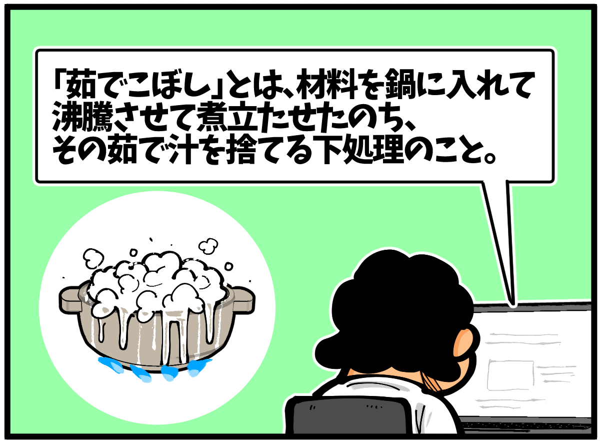 その誤った解釈の茹でこぼしを実践したことはなかったのが幸い。というか普通に「吹きこぼれ」と混同してますね。