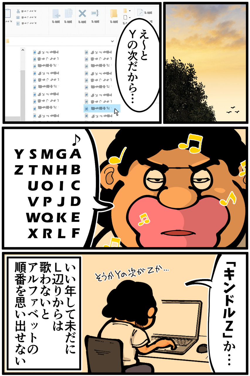 第1838話「アルファベットの順番」 2025年07月18日 セーブポイントが無いゲームかのように何故か最初から歌ってしまう。何が悲しくてこんな「たのしいえいかいわ」みたいなことを一人でやってるんだろう。次回に続きます。続き↓ 新しいKindleインディーズマンガを出版しました!(全編無料でご覧いただけます) ●登録していただくとライブドアアプリから更新通知が届きます↓(ライブドアアプリについて)●X(旧Twitter)やってます↓●Instagramでブログの過去記事など更新してます↓ 「絵日記」カテゴリの最新記事 < 前の記事次の記事 > コメント コメント一覧 (7) 1. とみこう 2025年07月18日 22:19 1コメ! それ分かります! 0 taikutsu_ken がしました 2. ペコ太郎 2025年07月18日 22:41 分かるー、一緒!あの歌を目的の文字まで歌わないと思い出せないのよ。 0 taikutsu_ken がしました 3. せい 2025年07月18日 23:03 アルファベットは、順番がわからなくなりますよね。 私の場合は、タイトルの前に『001』で数字でファイル名とかつけてますね。 数字だと、タイトルを間違えても、順番通りに保存の一覧に並んで、混乱しないです。 0 taikutsu_ken がしました 4. ゆきちお 2025年07月19日 03:45 そうそう‼️しかも歌ってても通り過ぎて2度歌う事も😅 0 taikutsu_ken がしました 5. まま 2025年07月20日 13:07 そうそう歌わないと分からない(笑) 知っているABCの歌は2種類あって皆さんの知っているABCの歌はどちらなのかな? 0 taikutsu_ken がしました 6. Zの次は 2025年07月21日 21:50 どうしてるのか気になります。 0 taikutsu_ken がしました 7. 鳥土竜 2025年08月10日 23:15 アメリカ人も歌わないと分かんないらしいから… 0 taikutsu_ken がしました コメントフォーム 名前 コメント 記事の評価 リセット リセット 顔 星 情報を記憶 コメントを投稿する