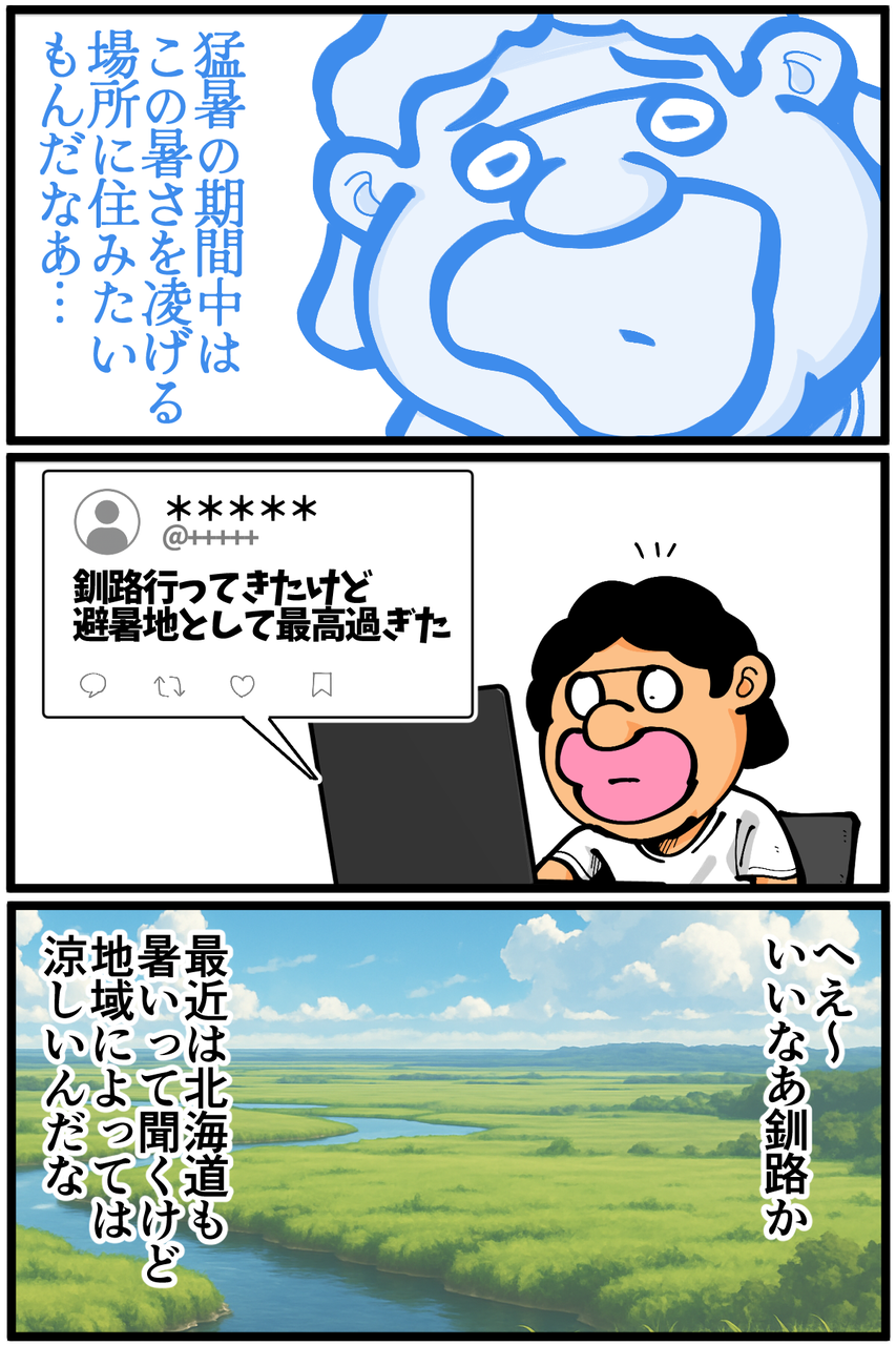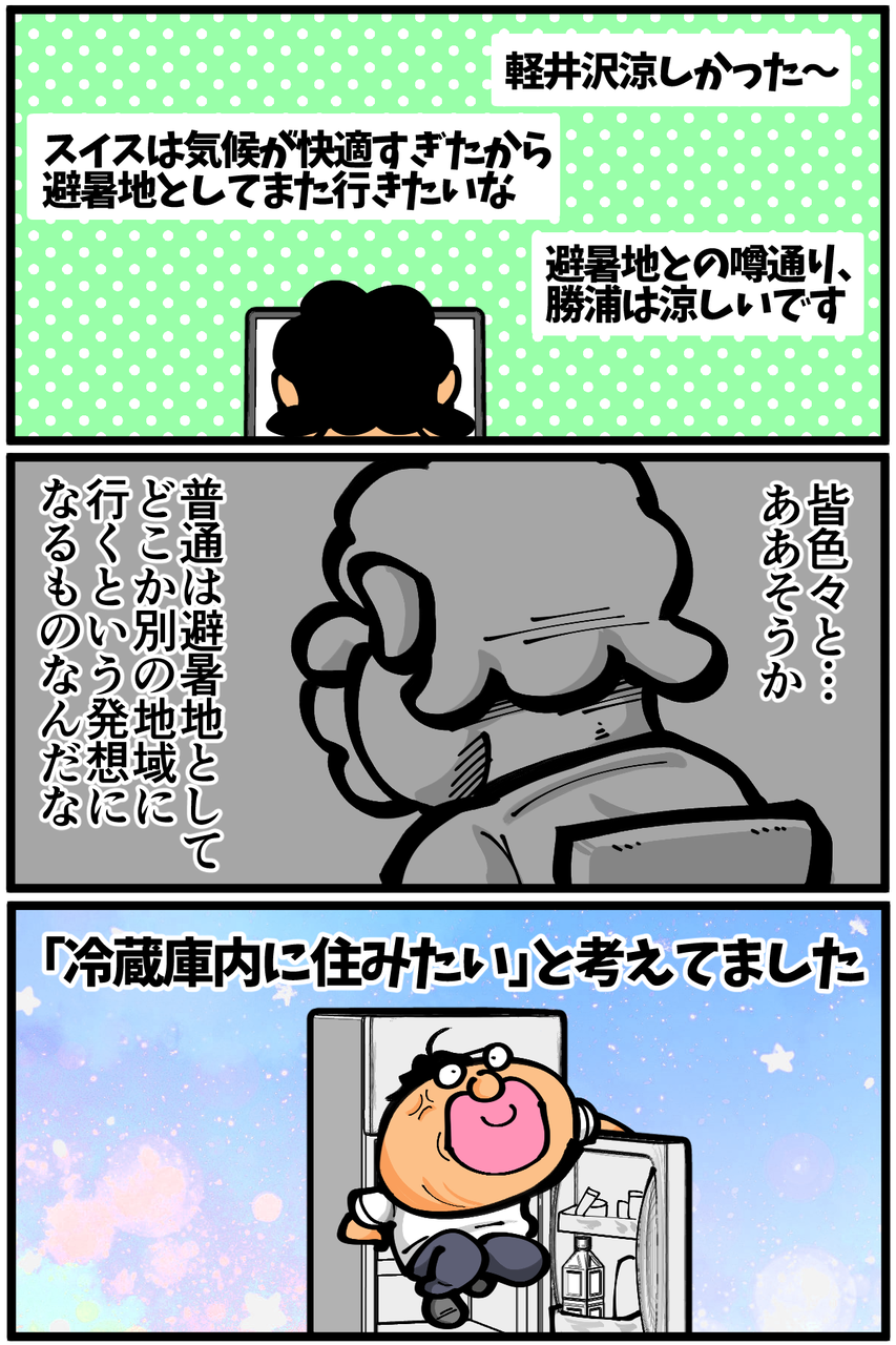 第1847話「暑さを凌げそうな場所といえば」 2025年08月19日 「冷凍庫だと寒すぎるから冷蔵庫の方がいいな」とかまで考えてた。金欠生活が長すぎて「避暑地」とか「別荘」みたいな発想が脳から一時消去されてました。次の記事↓ 冷蔵庫を買った時の話↓ 新しいKindleインディーズマンガを出版しました!(全編無料でご覧いただけます)●登録していただくとライブドアアプリから更新通知が届きます↓(ライブドアアプリについて)●X(旧Twitter)やってます↓●Instagramでブログの過去記事など更新してます↓ 「絵日記」カテゴリの最新記事 < 前の記事次の記事 > コメント コメント一覧 (6) 1. ぽちた 2025年08月19日 23:56 避暑地ですか 自分はまたてっきり図書館とかSCかとおもってました😅 考え方が庶民ですみません 0 taikutsu_ken がしました 2. ゆきちお 2025年08月20日 03:45 毎日暑いですね🥵 自分の先月職場のエアコン壊れて、修理が来月らしいので地獄です。隣のフロアから冷気をもらってるから外よりマシだけど動き回るのでやはり暑いです。一緒に冷蔵庫に住みましょ‼️ 0 taikutsu_ken がしました 3. ゆきちお 2025年08月20日 03:47 >>2 先月、自分の…ですね 暑さで頭が♨️ 0 taikutsu_ken がしました 4. ゆずきち 2025年08月20日 12:14 冷蔵庫も3-5℃ですよww 0 taikutsu_ken がしました 5. あ 2025年08月21日 18:09 釧路民です 今でこそ涼しいですが、数年前までは寒いでした 温暖化でやっと程よい気温になったかな? 0 taikutsu_ken がしました 6. メロン 2025年08月24日 01:10 図書館は? 0 taikutsu_ken がしました コメントフォーム 名前 コメント 記事の評価 リセット リセット 顔 星 情報を記憶 コメントを投稿する