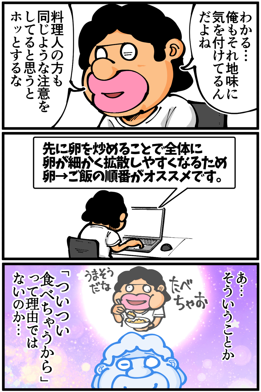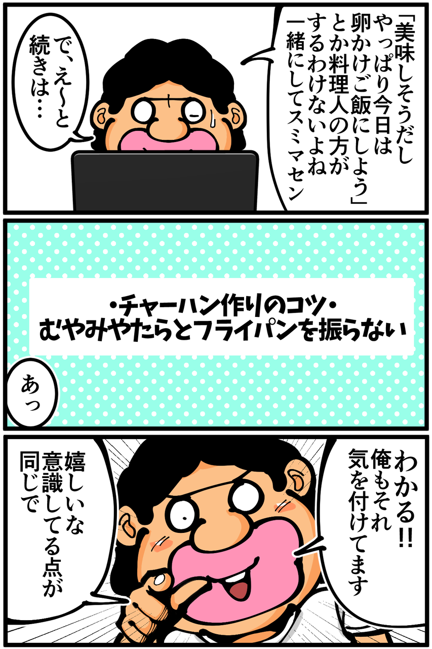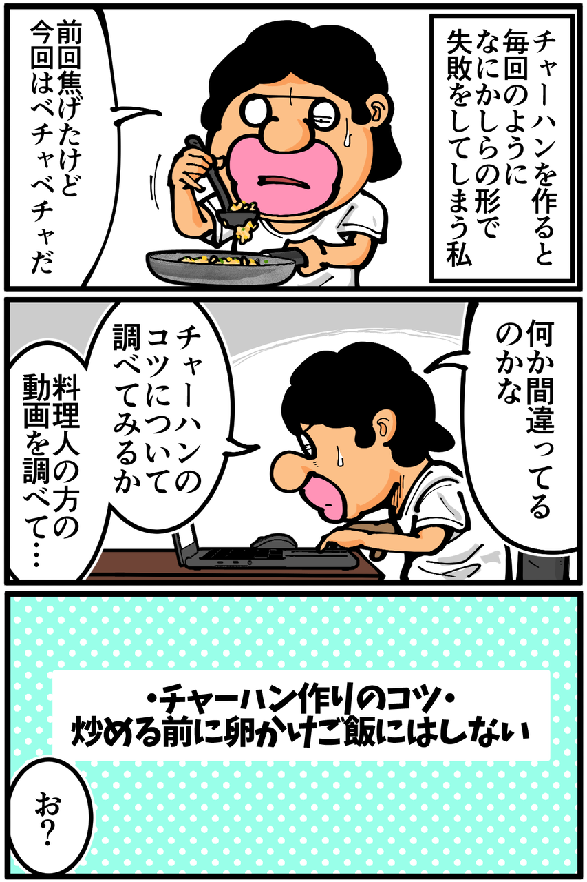 第1851話「チャーハン作りのコツを調べてみた結果」 2025年09月10日 フライパン振れば振るほどこぼれるの私だけでした。次の記事↓ 新しいKindleインディーズマンガを出版しました!(全編無料でご覧いただけます)●登録していただくとライブドアアプリから更新通知が届きます↓(ライブドアアプリについて)●X(旧Twitter)やってます↓●Instagramでブログの過去記事など更新してます↓ 「絵日記」カテゴリの最新記事 < 前の記事次の記事 > コメント コメント一覧 (11) 1. ペコ太郎 2025年09月10日 22:51 フライパン振るとポップコーンが弾けるように外に飛んでいきます!量が減るので振らないにこしたことはない笑 0 taikutsu_ken がしました 2. 紅茶スキー 2025年09月10日 23:46 正直、先生って 料理下手あるあるの 下手くそなくせにカッコつけだけ意識高くて、無駄に高度なことをしようとして失敗する の典型ですよね 鶏肉の梅ささみ巻きの時とかもそうでしたけど。 まずは初心者向けから一歩ずつですよ 0 taikutsu_ken がしました 3. おりゅう 2025年09月11日 00:33 「ヤンキー君と化学ごはん」って漫画で家チャーハンがベチャついたり焦げたりする話を科学的な観点から解決してて良かったです 他にも焼きそばがベチャったり野菜炒めの火の通りが上手く行かない時の話とかもあるのでオススメです 漫画としても面白いので是非読んでみてください! 0 taikutsu_ken がしました 5. ゆずきち 2025年09月11日 10:57 >>3 同じ漫画オススメしようと思ってました! 同じ人いて嬉しい☺️ 0 taikutsu_ken がしました 4. ゆきちお 2025年09月11日 05:19 食べちゃわないけどこぼします‼️ 一度に作る量を少なめにすると失敗しにくいです😁まとめて5人分とかだとベッタリ💦 0 taikutsu_ken がしました 11. 名無し 2025年09月14日 22:01 >>4 1.5人前が失敗しにくいとなにかで読みました。 0 taikutsu_ken がしました 6. ななし 2025年09月11日 11:21 油の代わりにマヨネーズ使うといいですよ! パラパラにしやすいです。マヨの味や匂いも気になりません! 自分は先にフライパンにマヨ出してごはん炒めてから卵ですが、卵先入れならごはんと先に絡めておくですかね! 0 taikutsu_ken がしました 7. 雪花 2025年09月11日 12:13 チャーハンを作っ…フライパンを振ってこぼすまで体調回復されたようで安心しました 体力しっかり戻してくださいね! 0 taikutsu_ken がしました 8. ぽちた 2025年09月11日 21:04 炒飯はくず野菜をたっぷりいれると冷蔵庫の掃除になっていいですね ちょっとだけ残った野菜やソーセージやハムなどを全部みじん切りにして炒めるとボリュームがでて美味しい 栄養もあるので卵だけの炒飯より体にいいですよ ご自愛ください 0 taikutsu_ken がしました 9. 通りすがり 2025年09月12日 00:38 余計なことをしない。 アレンジするのは基本が出来る様になってから。 0 taikutsu_ken がしました 10. 名無し 2025年09月14日 22:00 生卵でご飯をコーティングする=たまごかけご飯にしないって意味かと。 しっかりフライパンを熱してから☆多めの油を温めて、ネギとかニンニクとか香味系で香りづけしてから、卵をかき混ぜすぎずに8割がたふんわり炒めて、☆それらを一旦皿に取り出し、硬めの野菜があるならここで炒め始め、ご飯をコンソメとかで味付けしながら炒め、葉もの野菜はここらで投入し、卵を戻して混ぜ合わせて、醤油で香り漬けと塩コショウで味付け、あたりがオーソドックスな手順だと思います。。フライパンは、☆深さのある中華鍋以外はあまりふるとこぼすだけかも。 ☆のところがポイント。 0 taikutsu_ken がしました コメントフォーム 名前 コメント 記事の評価 リセット リセット 顔 星 情報を記憶 コメントを投稿する