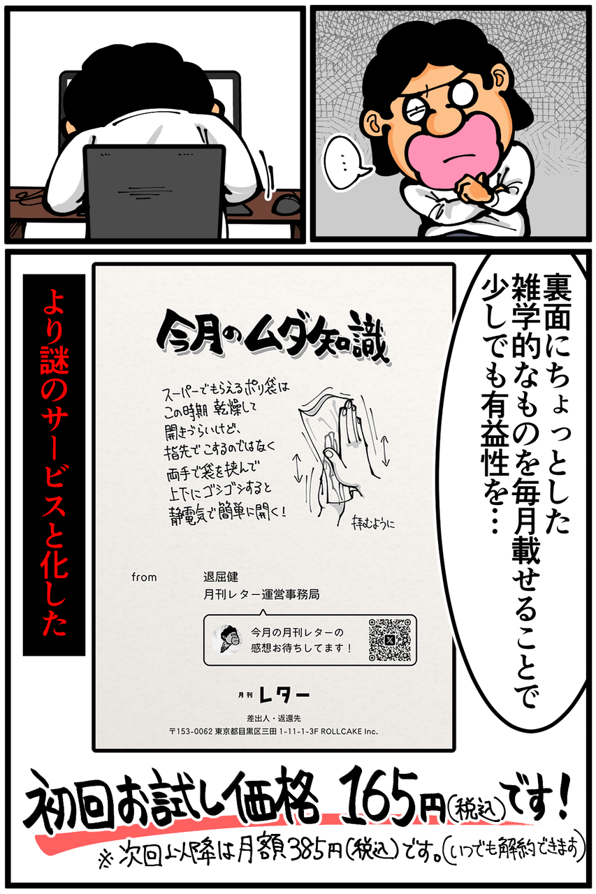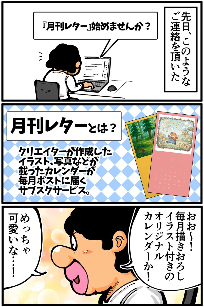 【お知らせ】イラスト付きカレンダーが毎月ポストに届く『月刊レター』を始めました! 2025年11月15日 こちらからお申込みいただけます!↓漫画内に書いたことの繰り返しになってしまいますが初回お試し価格が165円(税込)、次回以降が月額385円(税込)です!※解約もお好きなタイミングで簡単にできます。もしご興味ありましたら是非よろしくお願いいたします!! 「お知らせ」カテゴリの最新記事 < 前の記事次の記事 > コメント コメント一覧 (2) 1. ななな 2025年11月17日 12:02 ムダ知識が有用でちょっと欲しくなるww 0 taikutsu_ken がしました 2. こけし 2025年11月17日 21:58 申し込みました! 誰かから郵便(DM以外)が届く機会もめっきり減ったので、楽しみにしてま〜す 0 taikutsu_ken がしました コメントフォーム 名前 コメント 記事の評価 リセット リセット 顔 星 情報を記憶 コメントを投稿する