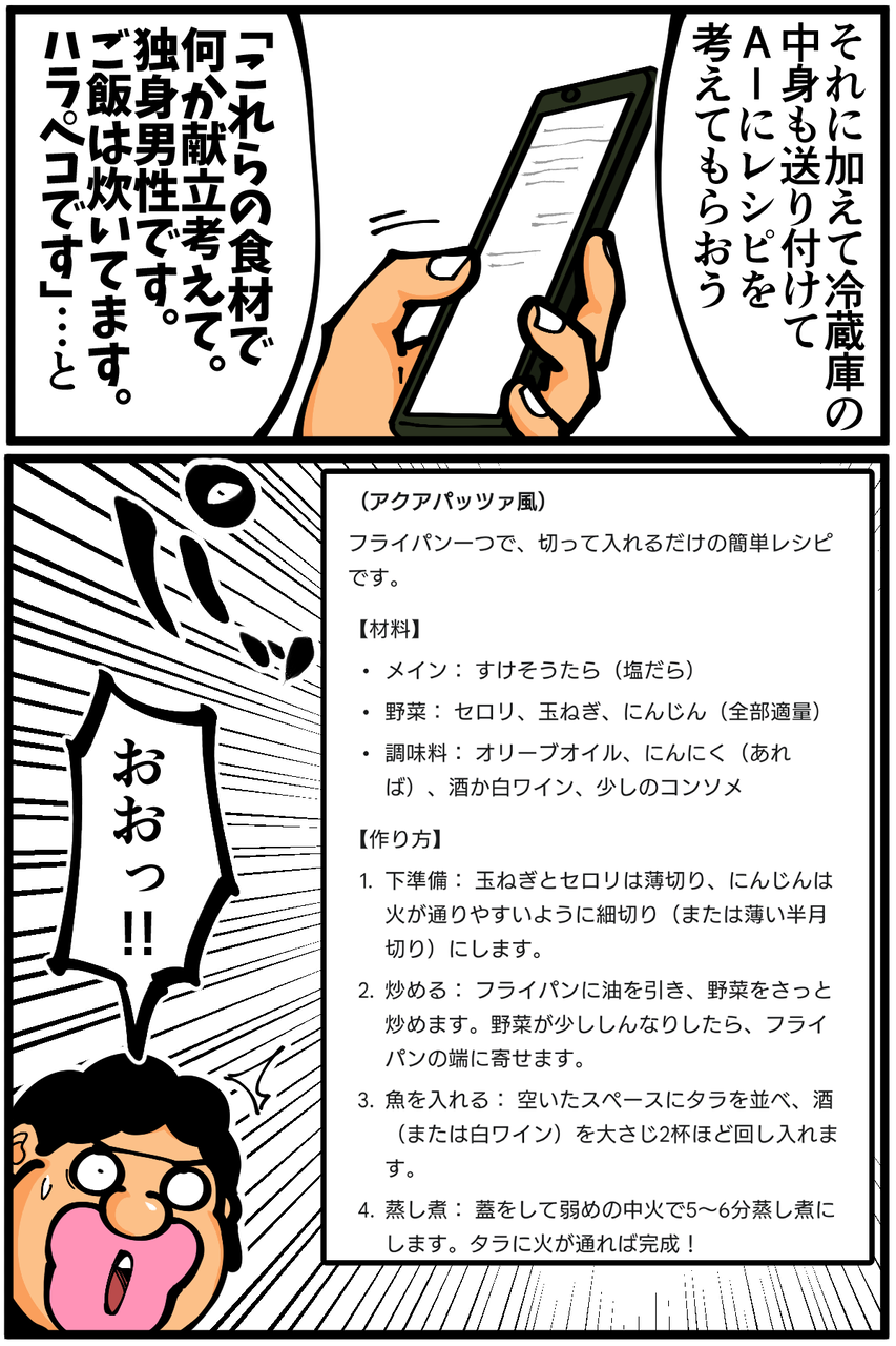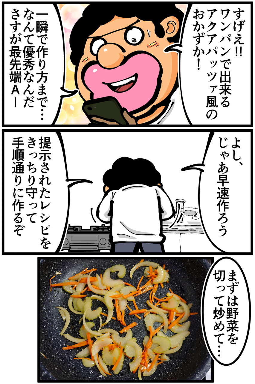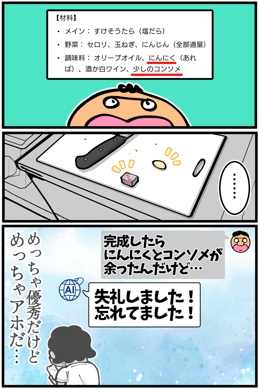 第1869話「AIに教えてもらったレシピ『タラのワンパンアクアパッツァ風』を作ってみる」 2026年01月08日 用意させといて使わせてくれない!なんか薄味だなと思いました。レシピに従い過ぎだろという話だけど。でもこれはこれで素材の味を感じられて美味しかったのでOKです。生たらこを調理した時の話↓ 新しいKindleインディーズマンガを出版しました!(全編無料でご覧いただけます)●登録していただくとライブドアアプリから更新通知が届きます↓(ライブドアアプリについて)●X(旧Twitter)やってます↓●Instagramでブログの過去記事など更新してます↓ 「絵日記」カテゴリの最新記事 「料理」カテゴリの最新記事 < 前の記事 コメント コメント一覧 (4) 1. ペコ太郎 2026年01月08日 22:48 うんまそー!盛り付けもキレイ!!タラって何気に身がバラバラになりません?オムレツ作ろうとして結果スクランブルエッグになったみたいな。 コンソメなくてめっちゃ素材の味だったんだろなー。やっぱAIだなぁ。 今年もブログ、楽しみにしてまーす! 0 taikutsu_ken がしました 2. マドン 2026年01月08日 23:13 AIもおっちょこちょいな一面があるんですね(笑) 0 taikutsu_ken がしました 3. 名無しさん 2026年01月09日 00:05 お元気そうでよかったです 今年も応援してます! 0 taikutsu_ken がしました 4. ゆきちお 2026年01月09日 18:25 AIなのに🤣 もしや中の人がいるのでは⁉️ 0 taikutsu_ken がしました コメントフォーム 名前 コメント 記事の評価 リセット リセット 顔 星 情報を記憶 コメントを投稿する