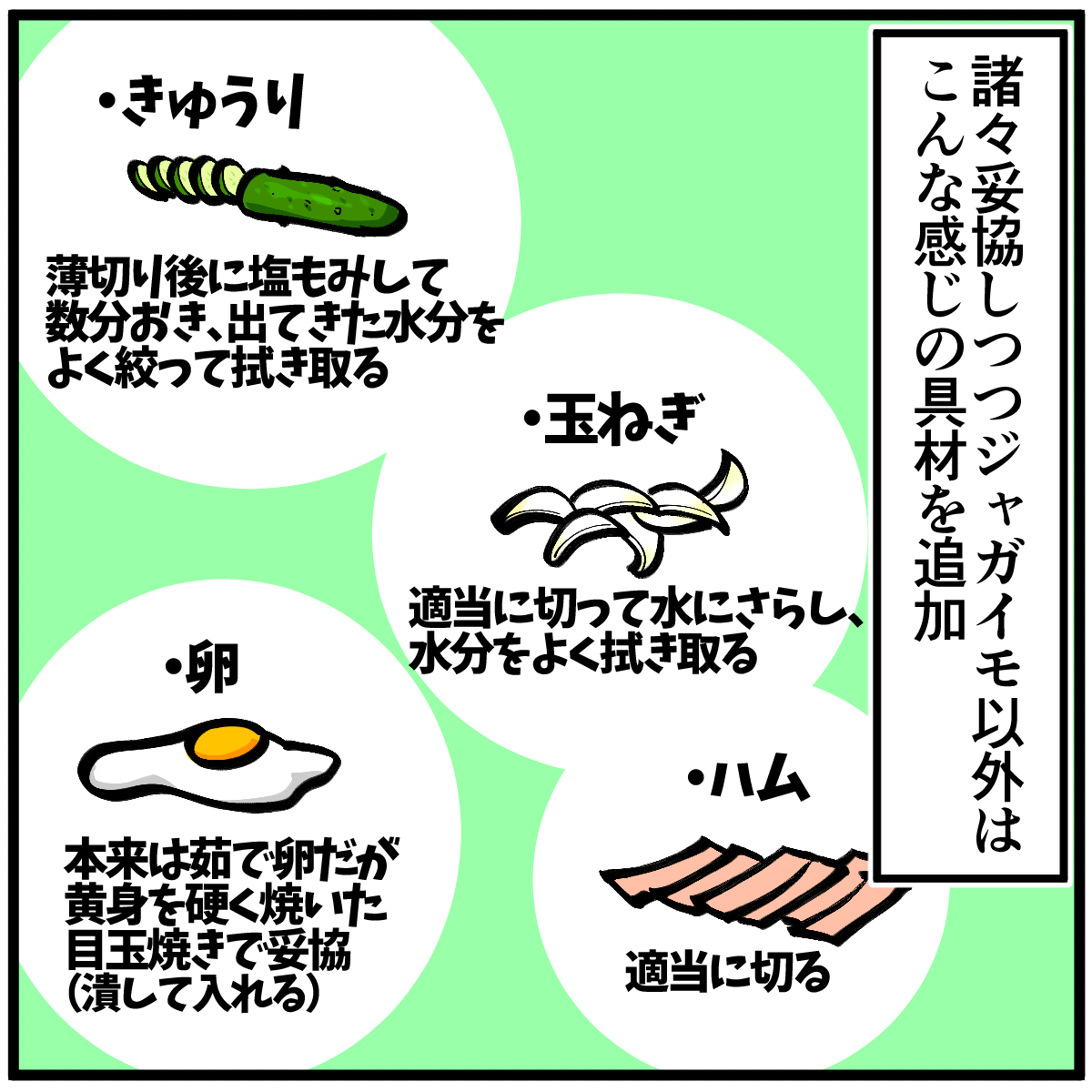 メインのじゃがいも以外の野菜はミックスベジタブルにしたら、レンチンして水分取るだけで終わりな上に彩りもきれいですよ。うちは隠し味にポン酢を少々入れます。