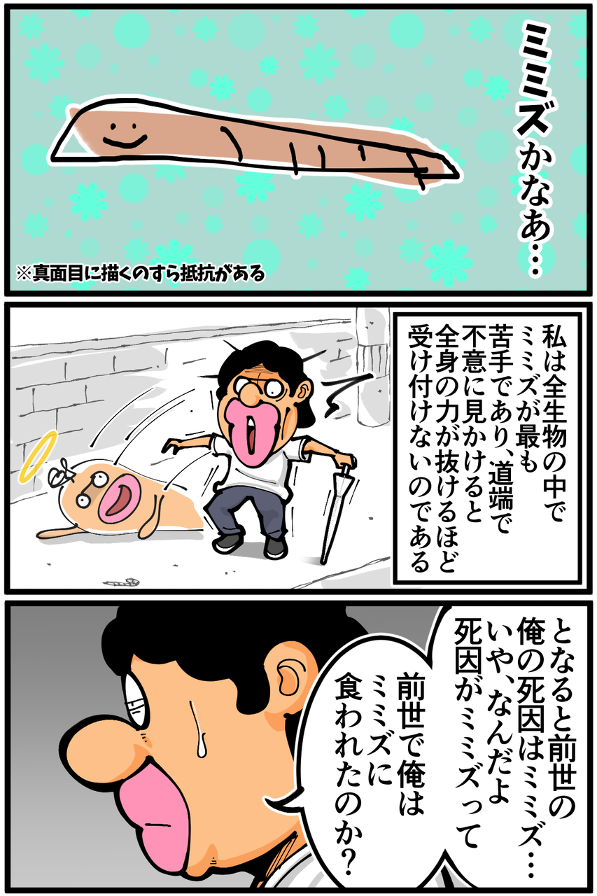 第1877話「前世の記憶が蘇る」 2026年04月04日 よくわかりませんが前世で私は腐敗した何かで、ミミズに食われて最期を迎えたんでしょうか。というかこれだけ苦手なのにこれからの時期の遭遇率が結構高いので困ります。わざわざ道路に出てこないでくれ…!!苦手過ぎてこうなる↓ 新しいKindleインディーズマンガを出版しました!(全編無料でご覧いただけます) ●登録していただくとライブドアアプリから更新通知が届きます↓(ライブドアアプリについて)●X(旧Twitter)やってます↓●Instagramでブログの過去記事など更新してます↓ 「絵日記」カテゴリの最新記事 < 前の記事 コメント コメント一覧 (8) 1. むじな 2026年04月05日 01:41 きっと巨大ミミズに食べられて滅んだ一族の末裔なんですよ 0 taikutsu_ken がしました 2. ke 2026年04月05日 07:03 逆にミミズを食べて苦しんだ事があるのかも知れない 0 taikutsu_ken がしました 5. ゆずきち 2026年04月05日 15:51 >>2 だとしたら前世はモグラかカメか…(笑) 0 taikutsu_ken がしました 3. ペコ太郎 2026年04月05日 08:23 雨の日や雨上がりに出てきますねー。うちは田んぼもそばにある田舎だから出現量が半端なくてひよぇー!ってなる。 海外のワームグミ?とかじゃばらストローで作る手作りミミズゼリーとかトライしてみてほしい! 0 taikutsu_ken がしました 4. 通行人@ 2026年04月05日 08:56 古代中国でミミズ壺の刑とかに処されたんでしょうか…… 0 taikutsu_ken がしました 6. あやじ 2026年04月06日 05:16 わかります!(ミミズは平気なんですがw) 私は苦手なものの名前さえ書けません。 画像が出てくると思うと対策方法すら検索もできません。 なのに、世間的に割と擁護される生き物なので 共感できる人も周りに居なくてツラたんです! ちなみにYモリです。。もうゾワゾワしてます! 0 taikutsu_ken がしました 7. ゆきちお 2026年04月06日 18:52 私もあります‼️子供の頃からずっとオニヤンマがすごーく怖いデス😱 あのオニヤンマ君とかいう蚊よけのグッズをなんとか目につかない様にしてほしい… 0 taikutsu_ken がしました 8. えりか 2026年04月07日 15:10 確かに残飯っぽい! というか、ミミズだったんじゃない! 0 taikutsu_ken がしました コメントフォーム 名前 コメント 記事の評価 リセット リセット 顔 星 情報を記憶 コメントを投稿する